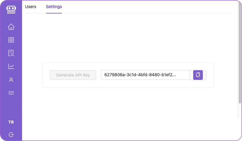 API anahtarı bilgisine Kullanıcı Yönetimi Ekranı’ndan ayarlara girerek "API anahtarı oluştur" butonuna basıp API anahtarınızı oluşturabilir veya mevcut API anahtarınızı kopyalayabilirsiniz.