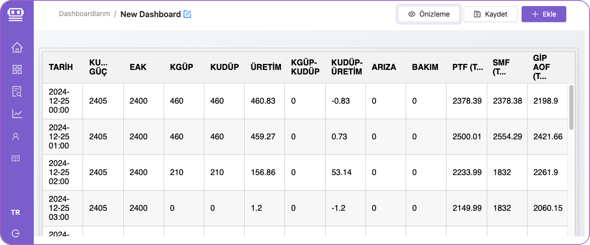“Ekle” tuşuna basılmasıyla seçimlere uygun bir tablo dashboarda eklenmiş olur.